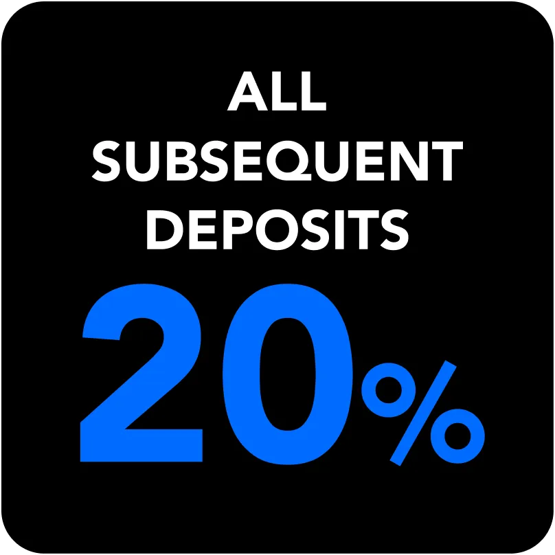 100% of the first $1000 of your deposit will be awarded as credits. Subsequent deposits be subject to a 20% bonus, up to a maximum of $10,000.